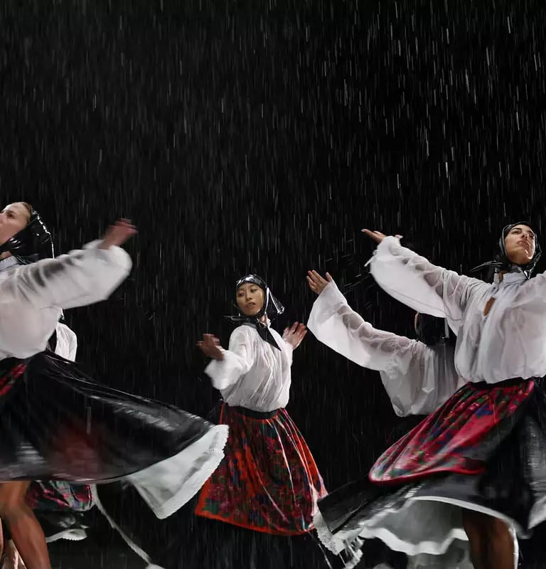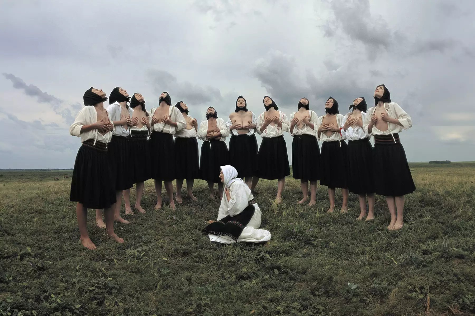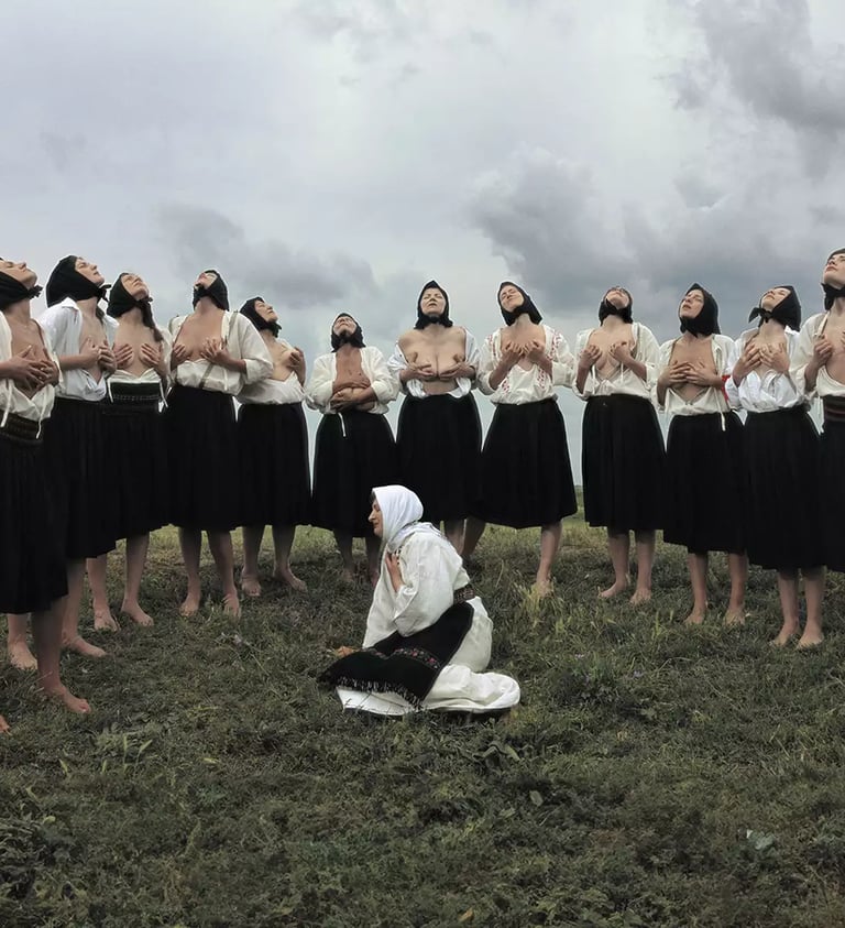 scaring the gods to stop the rain, full name of the performance, represents the tremendous effort of women to protect their village from the torrential rain, threatening to drown their crops and doom their people to famine. They do so by baring themselves to the earth and sky, screaming and roaring, "transforming the body into a divine weapon" by Abramović's words. A similar ritual exists in the Finnish folk magic as well, in which women would bare themselves to bears and wolves, to scare them away with their "maw" of a kind.